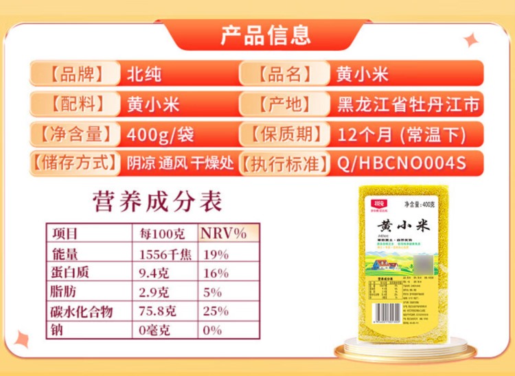 商品名称:【精选】北纯 黄小米 小黄米 月子米 小米粥 400g/袋 (计价单位:袋)