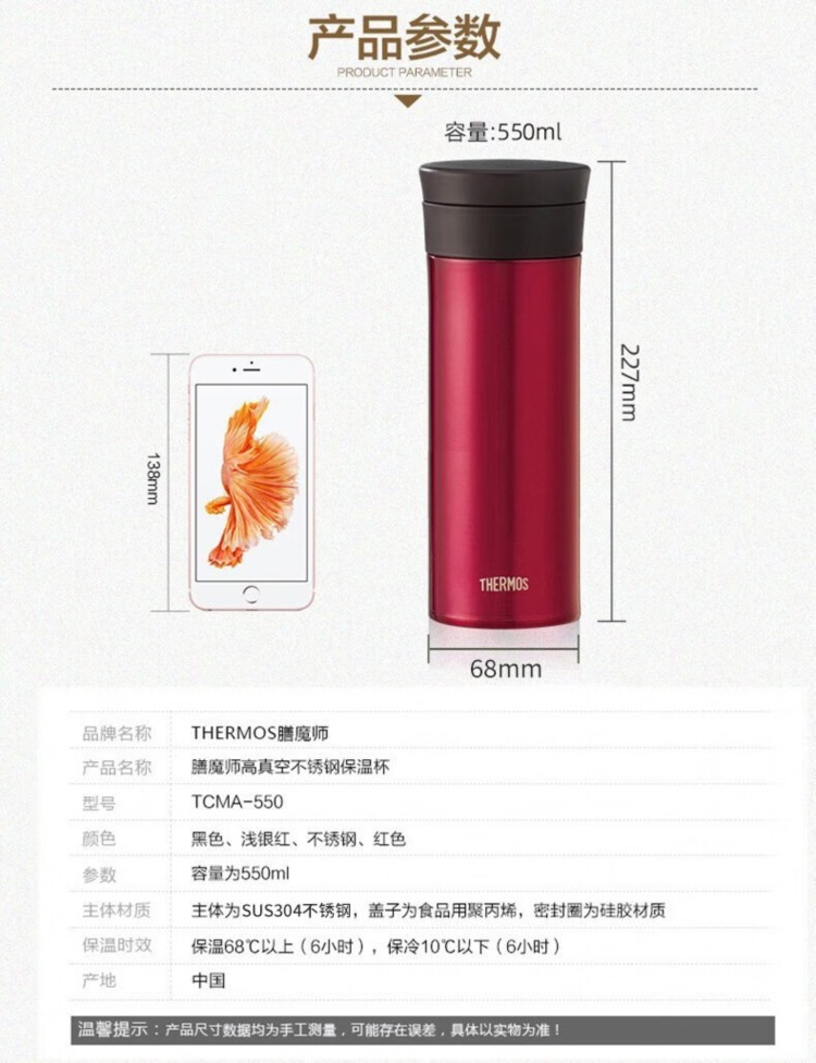 商品名称:【精选】膳魔师 TCMA-550 真空保温杯 550ml 不锈钢 酒红