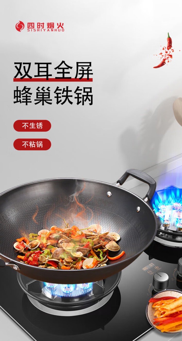 商品名称:【精选】四时烟火 双耳全屏蜂巢铁锅 TB-13 44cm带盖