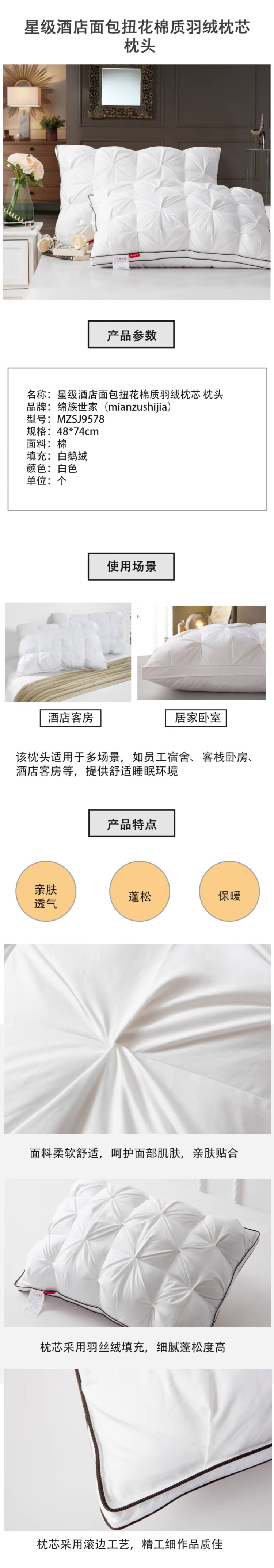 商品名称:【精选】绵族世家 星级酒店面包扭花棉质羽绒枕芯 枕头 MZSJ9578 48*74cm (白色)
