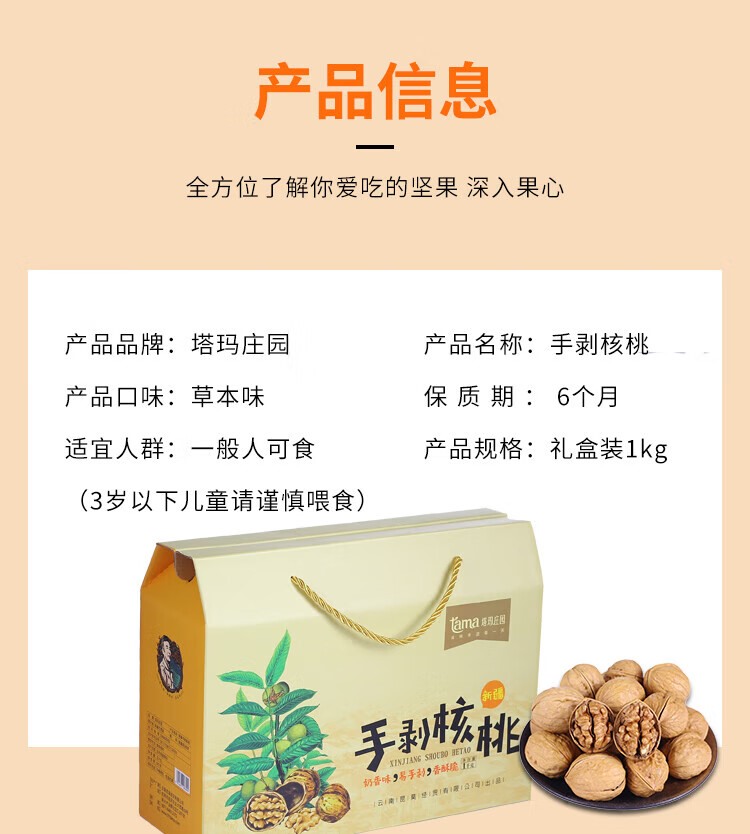 商品名称:【精选】塔玛庄园(GBSSX)手剥核桃(草本味)礼盒 坚果炒货零食礼盒 每份净含量1000g