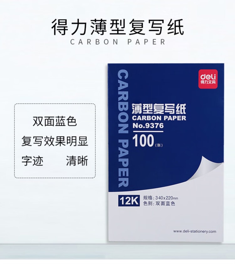 商品名称:【精选】得力(deli) 9373 32K 薄型 100页/盒 复写纸 (计价单位:盒) 蓝色