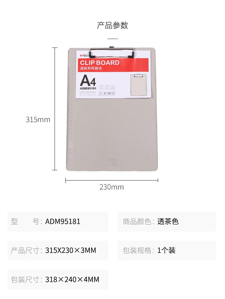 商品名称:【精选】晨光(M&G) ADM95181 A4 板夹 (计价单位:个) 透明茶