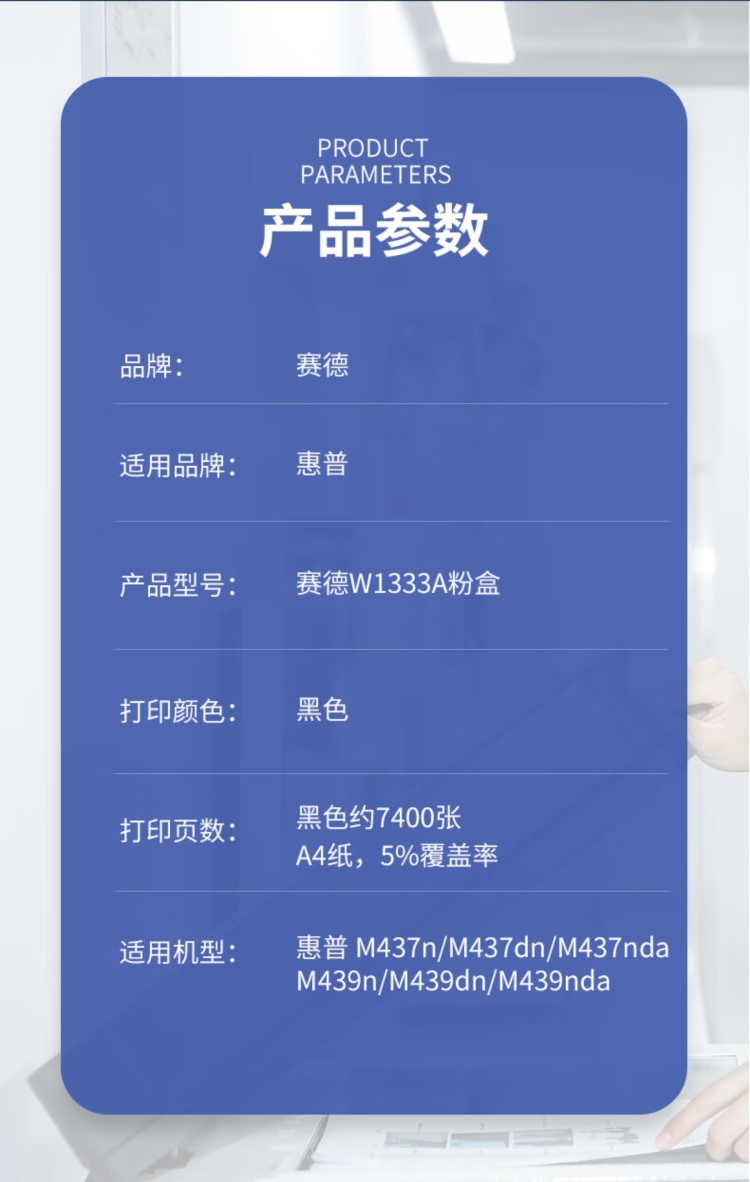 商品名称:【精选】赛德 W1333A 粉盒 适合惠普m437dn/nda m439n/dn/nda 黑色(单位:支)