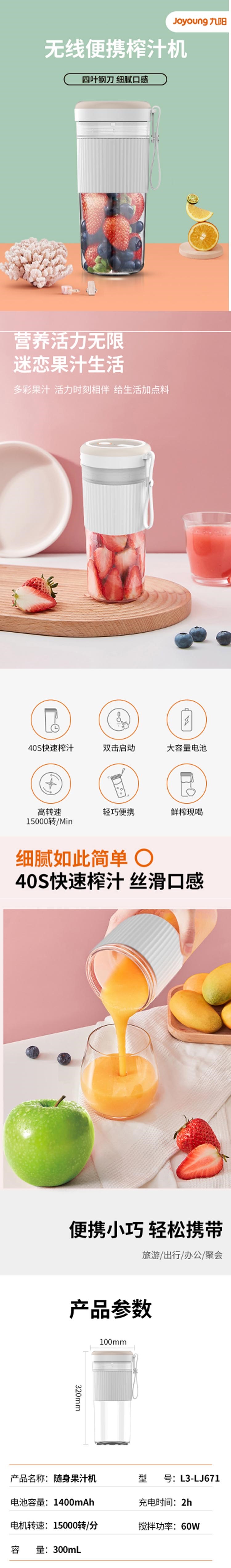 商品名称:【精选】九阳 L3-LJ671 榨汁机家用多功能小型便捷式全自动果汁机 (单位:台)