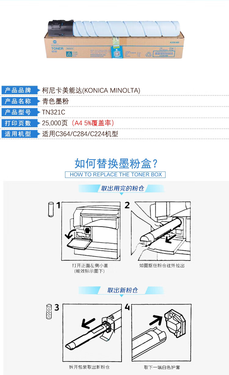 商品名称:【精选】柯尼卡美能达 TN321C 25000页 墨粉 (计价单位:盒) 适用C364/C284/C224 青色