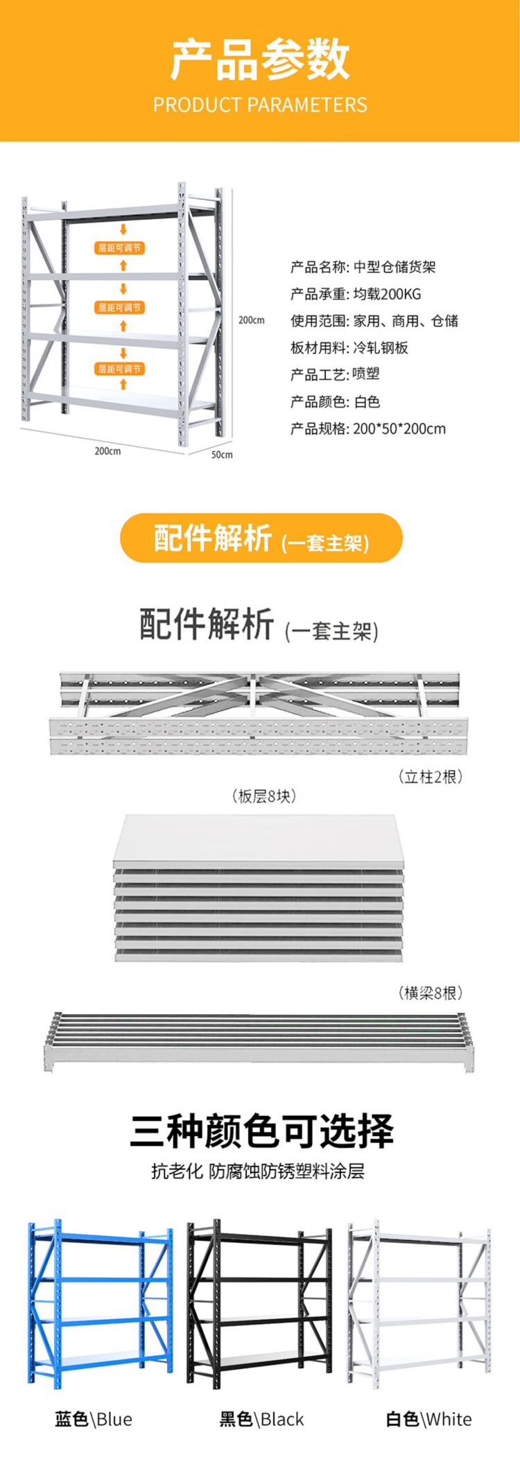 商品名称:【精选】澳美佳 中型仓储货架 200*50*200cm (计价单位:组) 白色