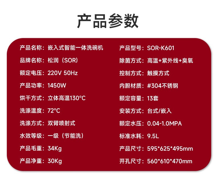 商品名称:【精选】松润SOR-K601 595*625*495 台式\嵌入式两用洗碗机银色(单位:台)