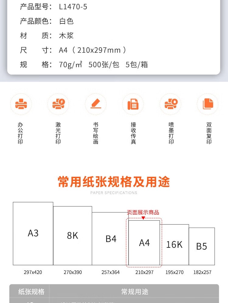 商品名称:【精选】及至 L1470-5 橙及至复印纸 A4 70g 500张/包 5包/箱 (计价单位:箱) 白色