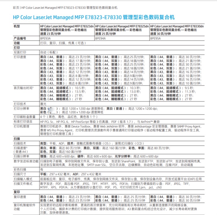 商品名称:【精选】惠普(HP) MFP E78323dn A3彩色激光大型数码复合机 打印 复印 扫描 企业级