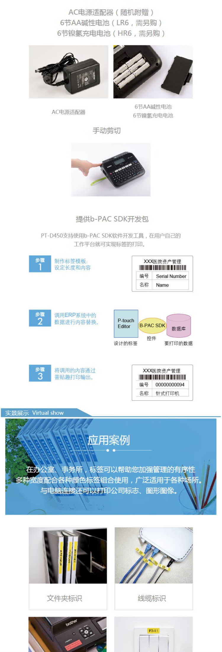 商品名称:【精选】兄弟 PT-D450 打印宽度3.5-18mm 打印速度20mm/s 精度180dpi 热转印 标签打印机 (计价单位:台)黑色