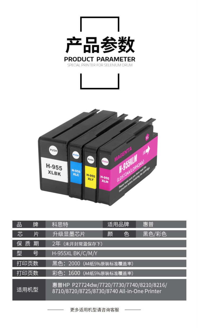 商品名称:【精选】科思特 955XL Y 黄色墨盒 适用惠普OfficeJet Pro 8210/8216/8710/8720/8725/8730/8740 All-in-One Printer(计价单位:个)黄色 黄色
