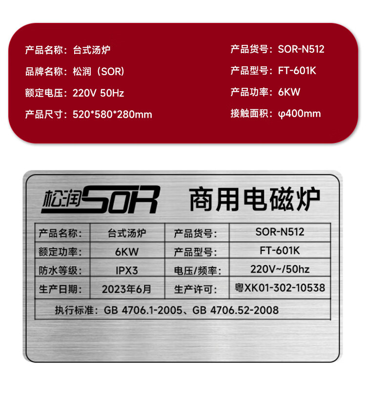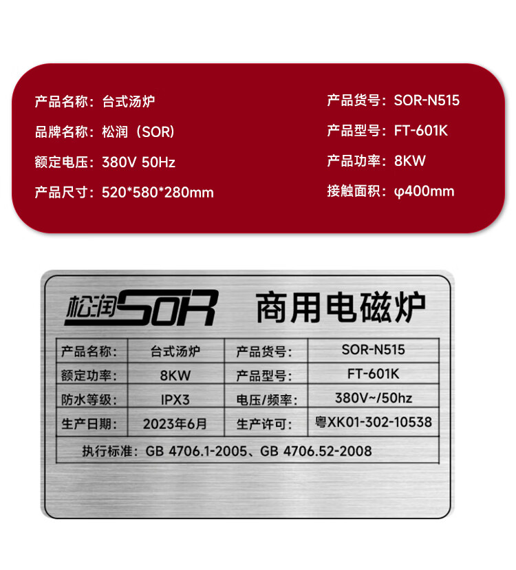 商品名称:【精选】松润 SOR-N517 520*580*280 台式汤炉银色(单位:台)