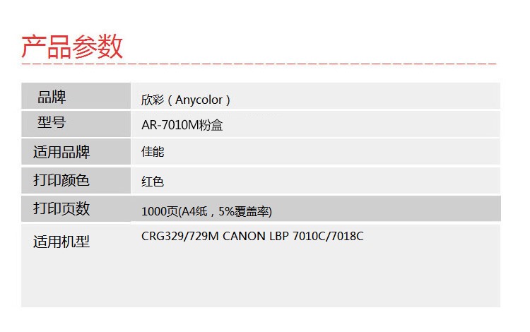 商品名称:【精选】欣彩(Anycolor) CRG329粉盒 大众版 AR-7010M红色 适用佳能CRG729M LBP 7010C 7018C