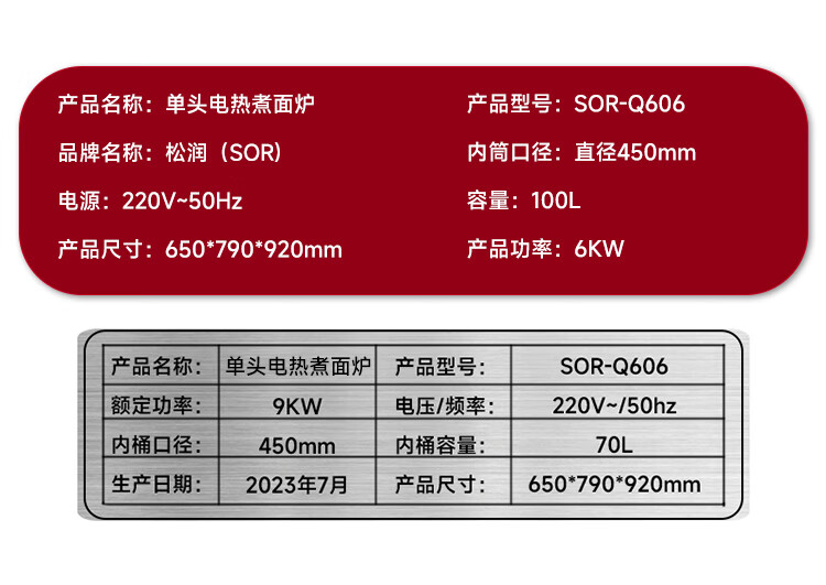 商品名称:【精选】松润SOR-Q607 800*900*1020 单头50型电热煮面炉380V银色(单位:台)