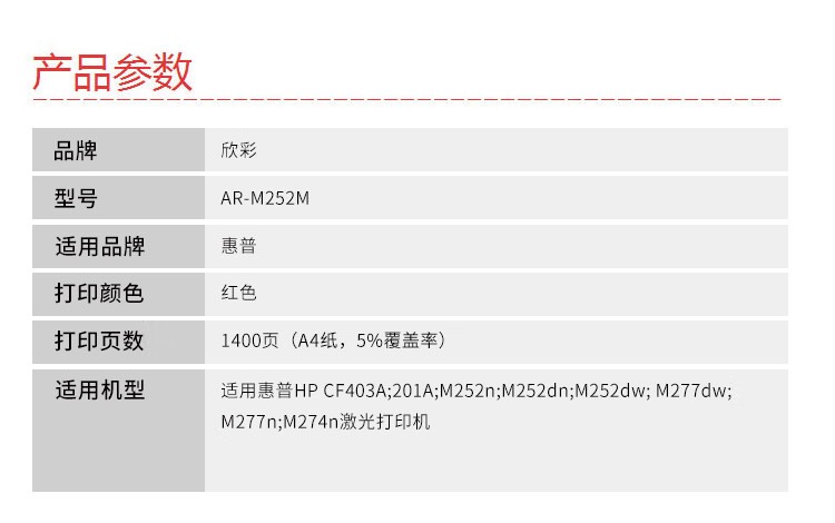 商品名称:【精选】欣彩 AR-M252M 硒鼓大众版 适用惠普HP CF403A 201A M252n M252dn 打印量1400页 (计价单位:支) 红色