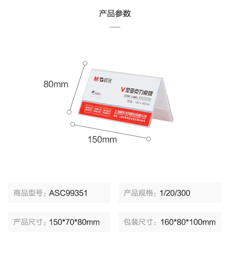 商品名称:【精选】晨光 M&G 商务V型会议桌牌 ASC99351 150*80mm