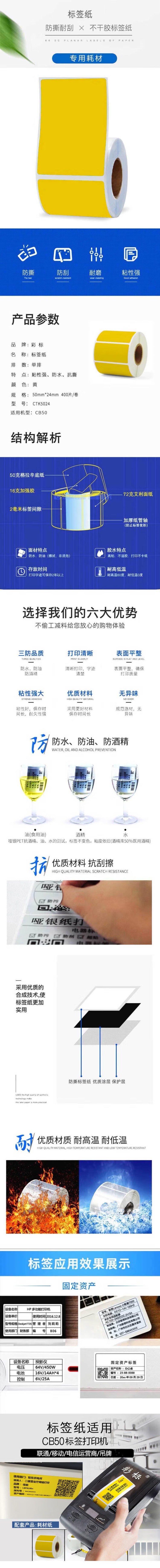商品名称:【精选】彩标 标签纸 CTK5024 50mm*24mm 400片/卷 (黄色)