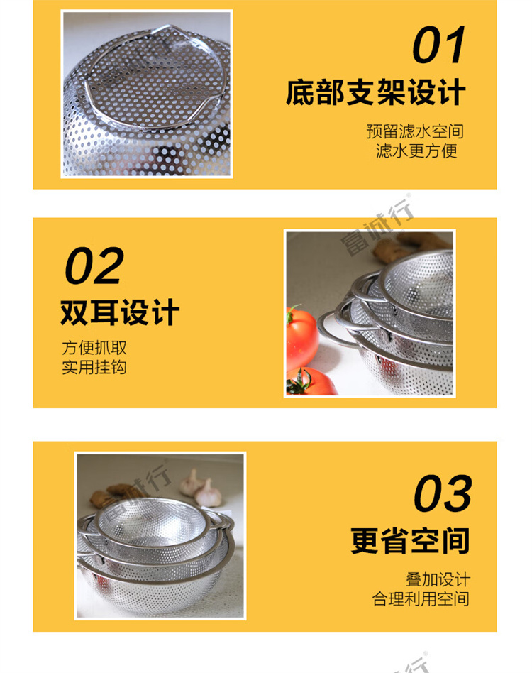 商品名称:【精选】富诚行 不锈钢加厚沥水盆 漏盆 密孔多用篮 加厚款双耳篮 19.5cm
