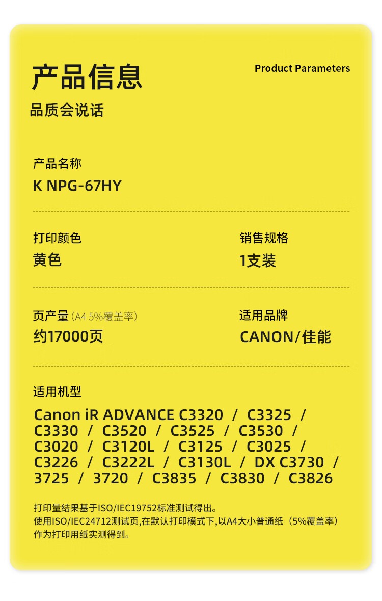 商品名称:【精选】科思特(KST) NPG-67H 大容量 带芯片 适用佳能iR ADVANCE C3320/3325/3330/3520/3525/3530/C-EXV49/GPR-53/C3020 打印量17000页 加粉量463g 分离式粉盒 黄色 (计价单位:个)