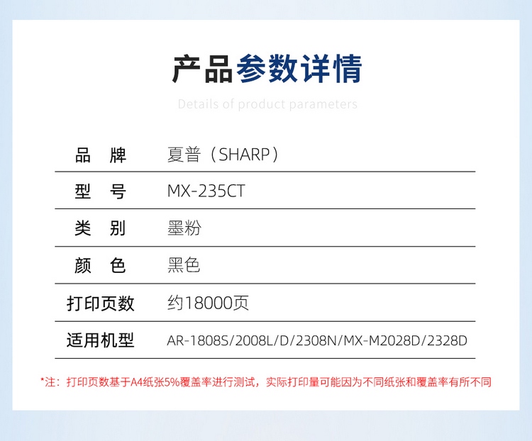 商品名称:【精选】夏普 复印机墨粉盒 MX-235CT 适用机型:AR-1808S/2008D/2008L/2308D/2308N/MX-M2028D A4幅面5覆盖率约1.8万页 500克 黑色