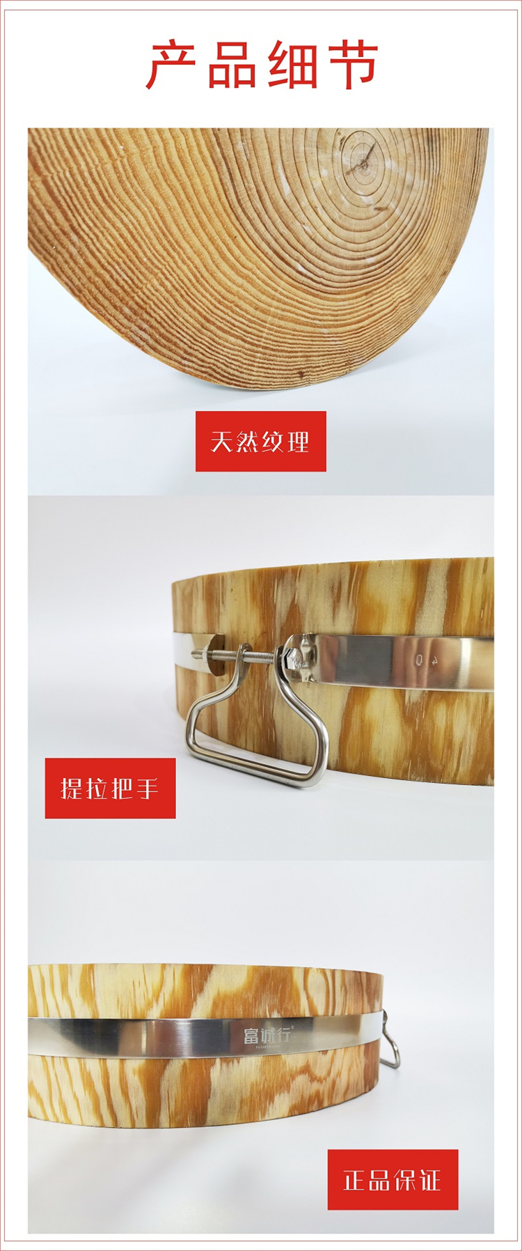 商品名称:【精选】富诚行(FCH)(GBHX) 原木色 松木砧板加钢圈 厚15cm 直径45CM