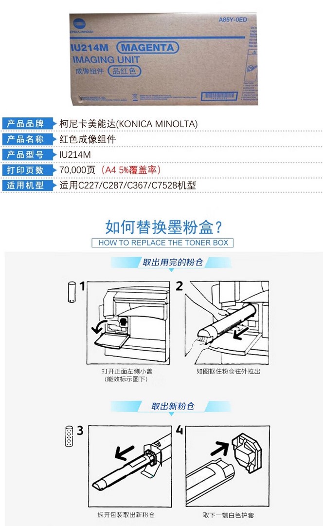 商品名称:【精选】柯尼卡美能达 成像单元 IU214M 适用C227/C287/C367/C7528机型 红色