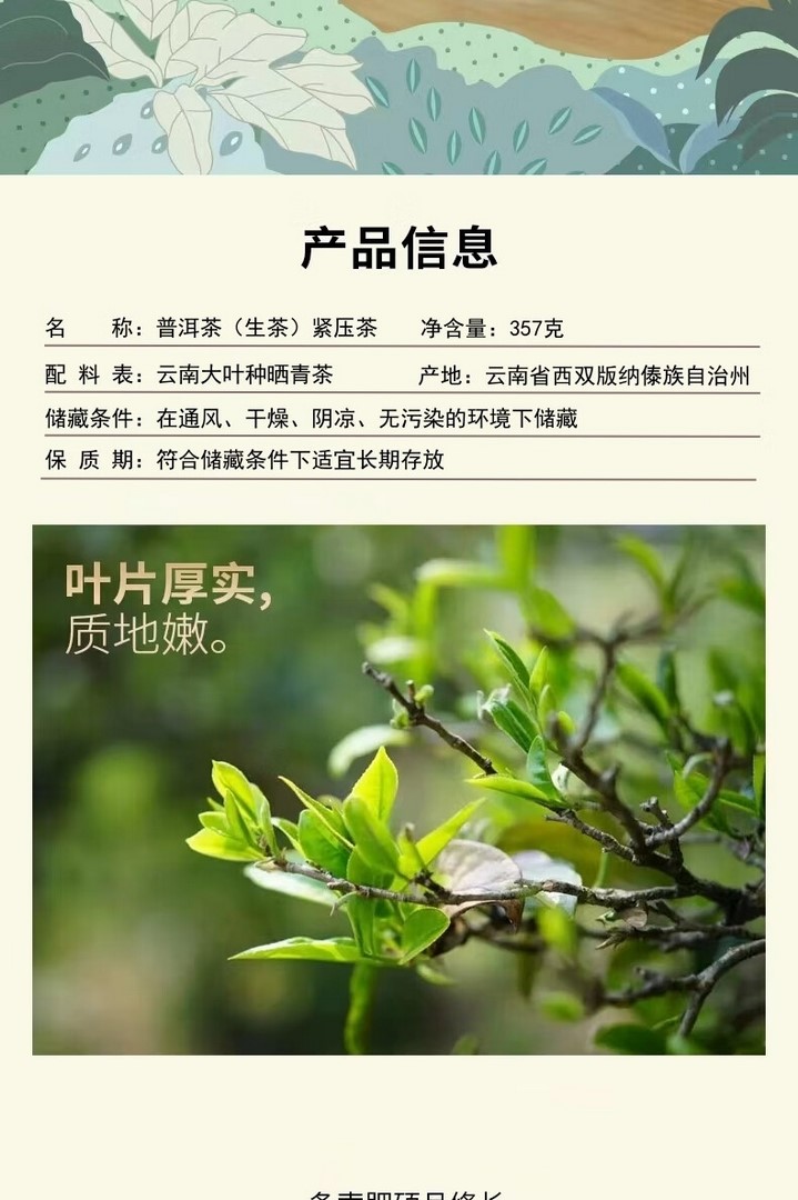 商品名称:【精选】碧琳茗扬 PS3570 布朗山大树普洱茶 生茶 357g(单位:饼)
