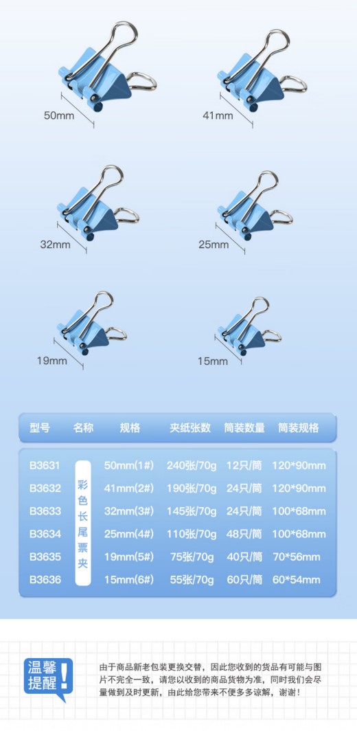 商品名称:【精选】齐心(Comix) B3635 5#19mm 40只/筒 长尾夹 (计价单位:筒) 彩色
