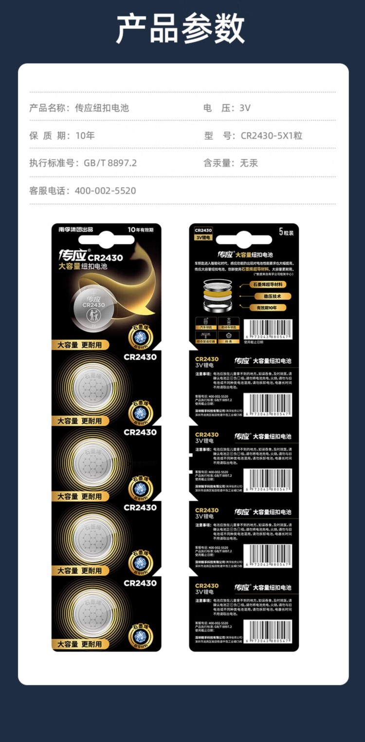 商品名称:【精选】南孚 NANFU 纽扣电池 CR2430 3V 5节/卡 40卡/箱 新老包装交替发货