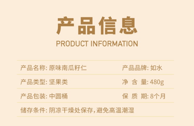 商品名称:【精选】如水(GBHX)南瓜籽仁480g/桶 烘焙坚果绿色南瓜子仁 生熟适中健康休闲零食