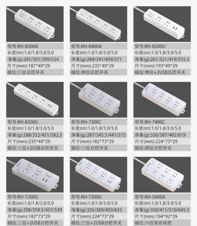 商品名称:【精选】锐尔斯 RH-6880B 延长线插座 八位总控 按键带灯 五孔*4 两孔*4 过载保护 全长5米 (计价单位:个)