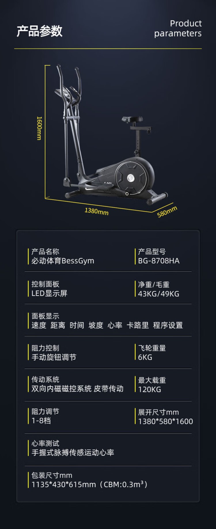 商品名称:【精选】必动 BG-8708HA 卧式椭圆机 1380*580*1600mm (计价单位:台)
