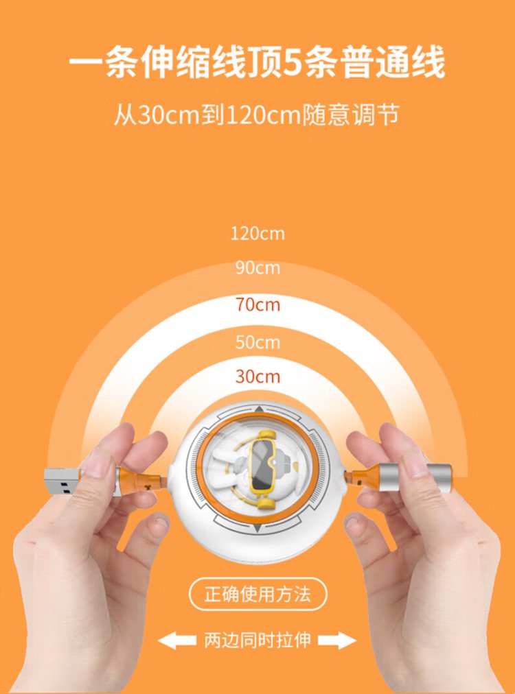 商品名称:【精选】沃品 LC023 太空舱伸缩快充一拖三数据线 产品尺寸:1.2M (计价单位:条) 白橙色