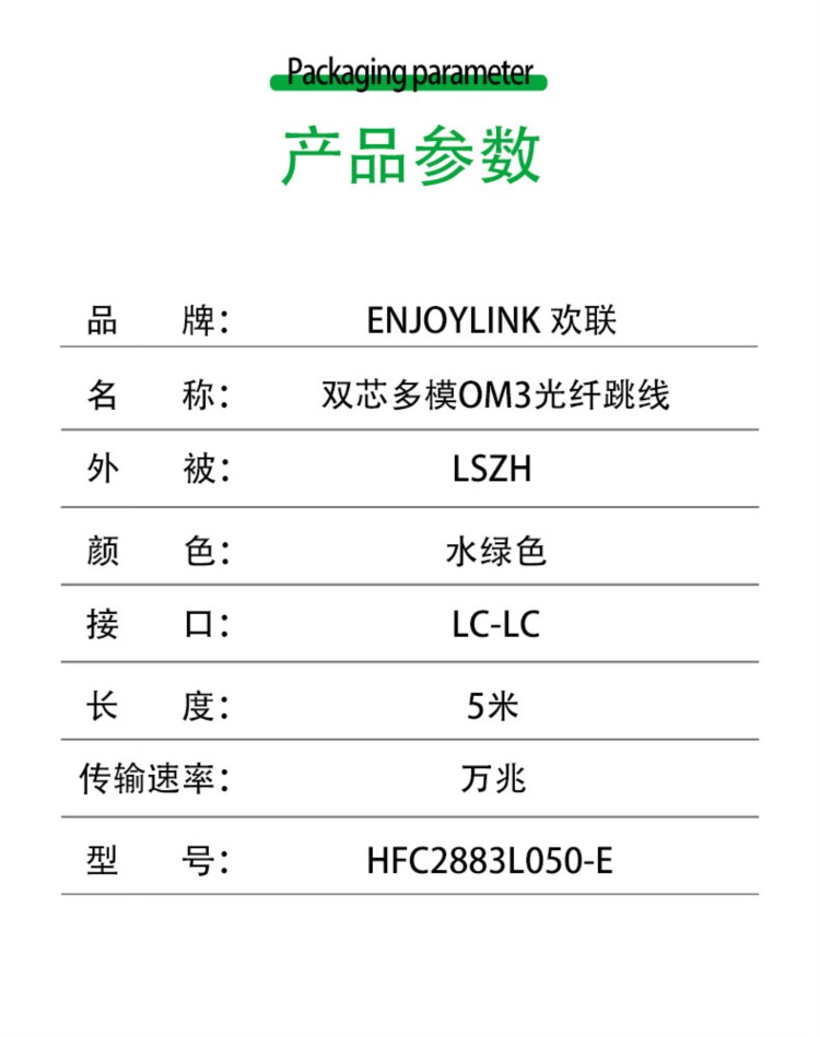 商品名称:【精选】欢联 LC-LC双芯多模OM3光纤跳线 HFC2883L050-E 5M (水绿色)