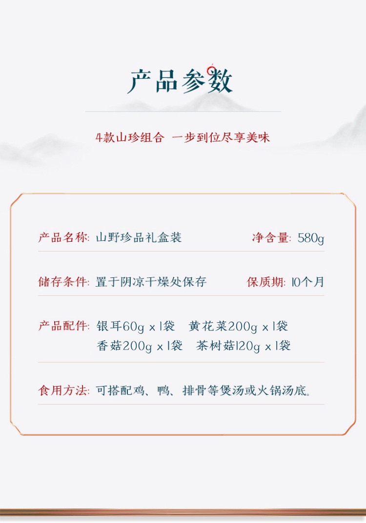 商品名称:【精选】滋美世家 山野珍品礼盒装 580g (计价单位:盒)