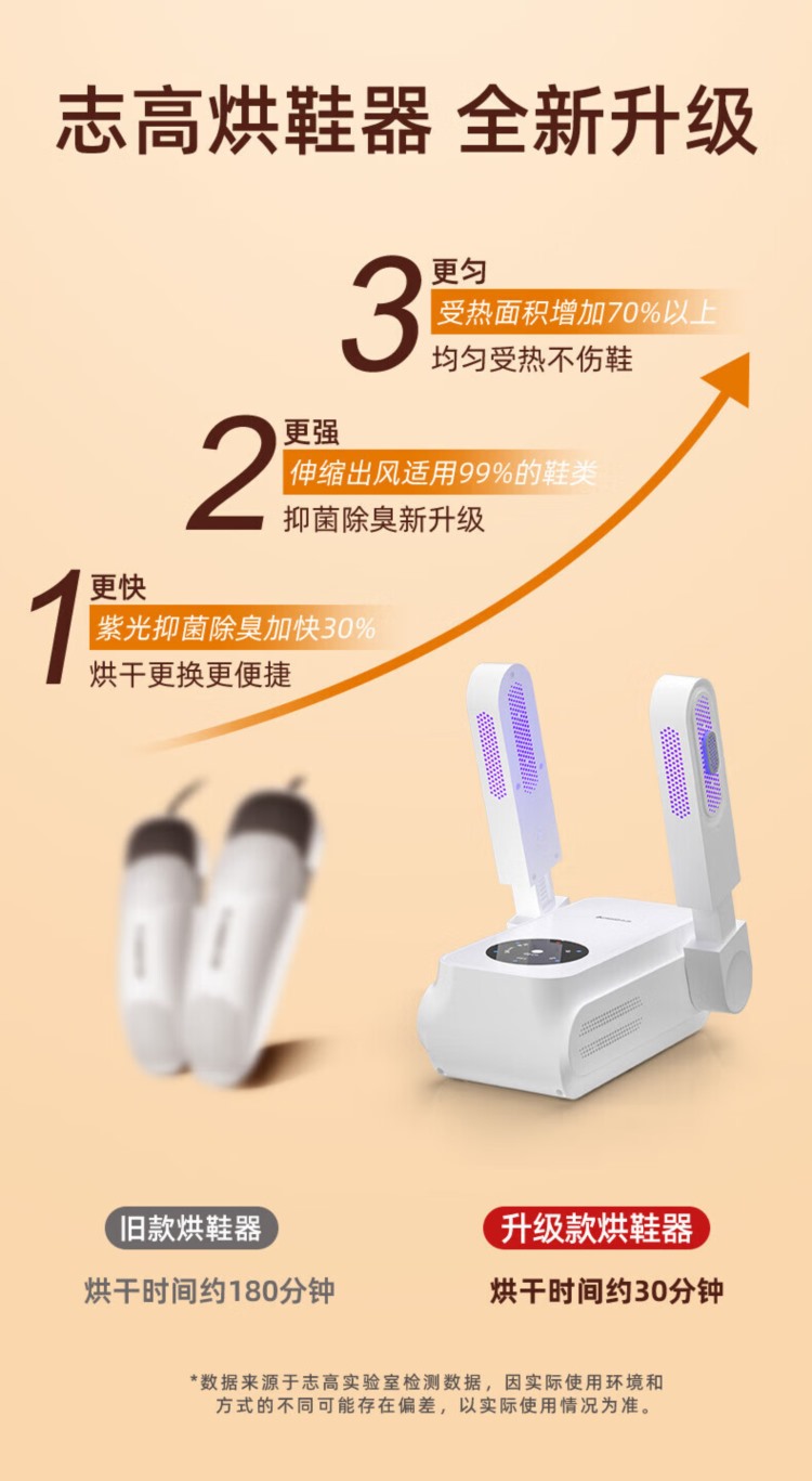 商品名称:【精选】志高(CHIGO)(GBHX)烘鞋器 机械伸缩定时款 235*185*250mm 【玫瑰盐盒+紫光杀菌】单位:台