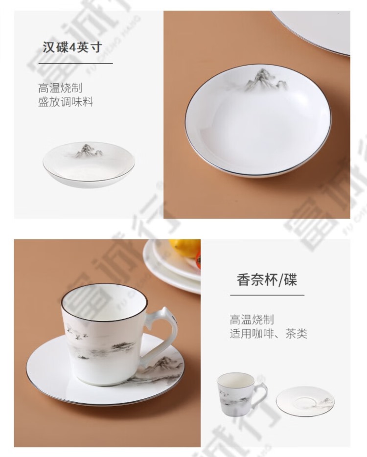 商品名称:【精选】富诚行(FCH)(GBHX) 陶瓷碗盘套装 餐具套装 陶瓷餐具 碗碟套装 秀丽山河系列 摆台十件套