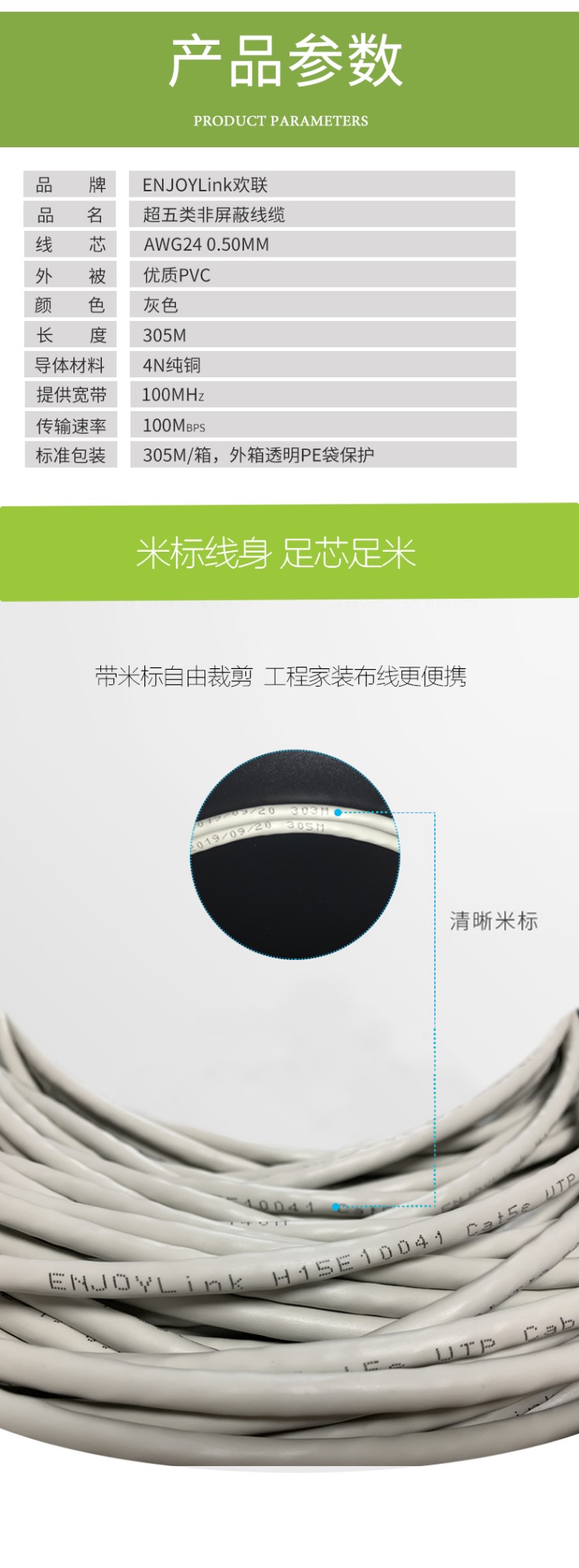 商品名称:【精选】欢联/ENJOYLINK H15E10041-E 超五类非屏蔽网线 305M箱 灰色(单位:箱)