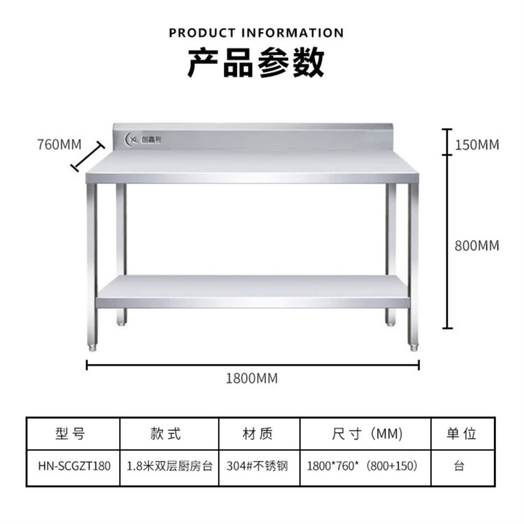 商品名称:【精选】创鑫利双层工作台 HY-SCGZT1500 1500*760*800+150mm 不锈钢 (计价单位:张)