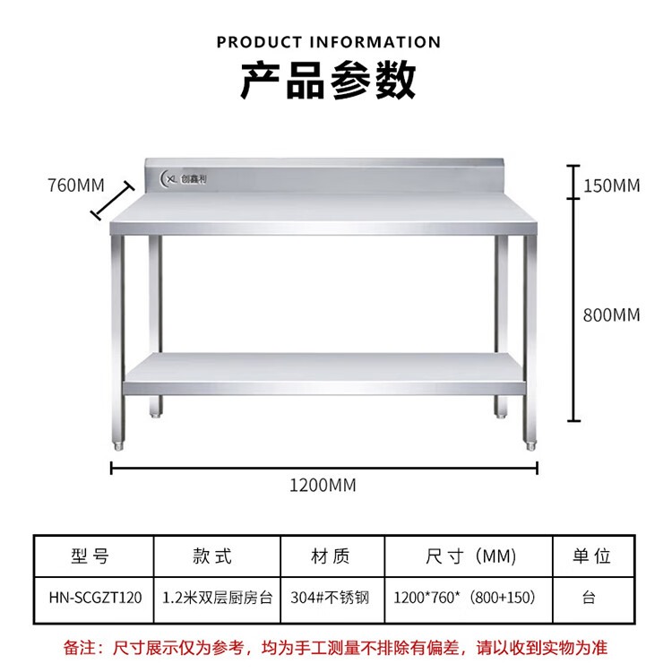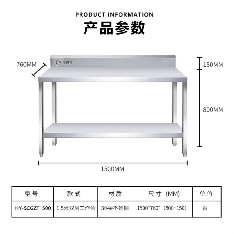 商品名称:【精选】创鑫利 单层工作台 HY-DCGZT1200 1200*760*800+150mm 不锈钢 (计价创鑫利 单位:张)