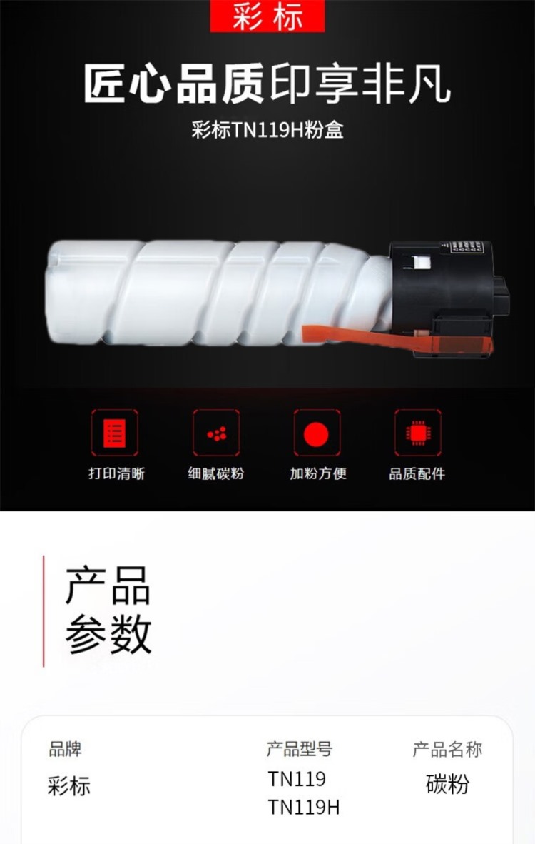 商品名称:【精选】彩标 粉盒 适用柯尼卡美能达BH-7719/195/235/215/7723/206等 TN119H 大容量单支装 (黑色)