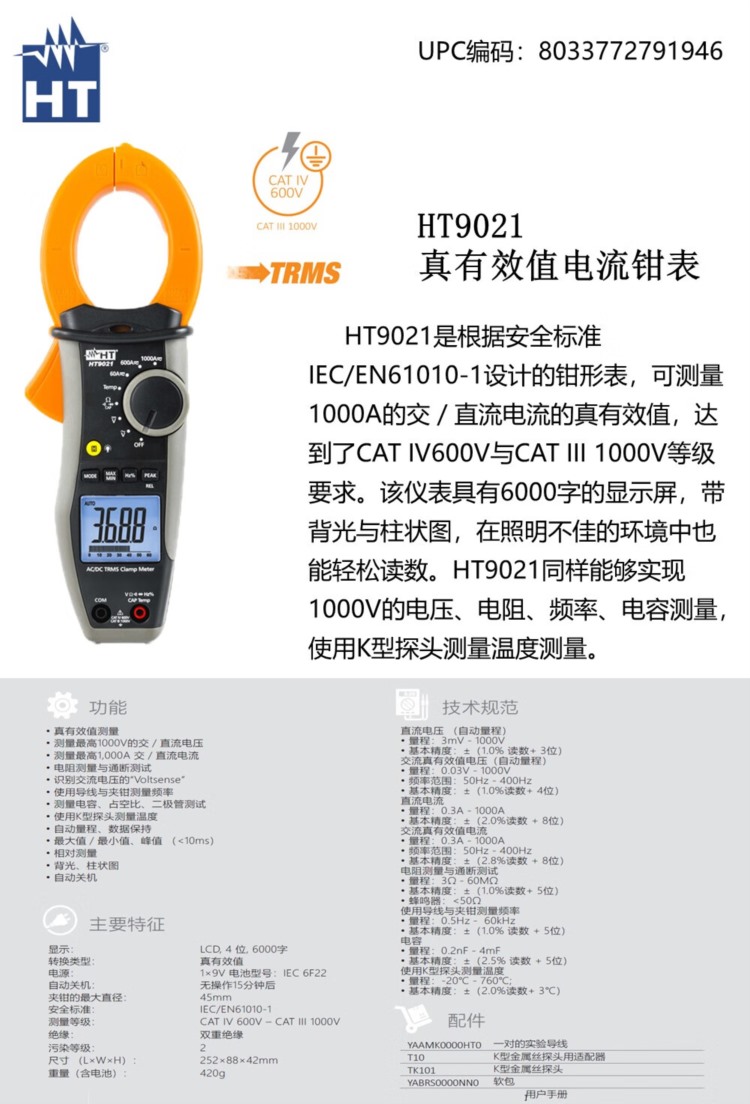 商品名称:【精选】HT HT9021 钳形电流表 (计价单位:台) 999A 交/直流真有效值