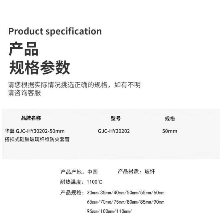 商品名称:【精选】华翼 GJC-HY30202 搭扣式硅胶玻璃纤维防火套管 50mm (计价单位:米)