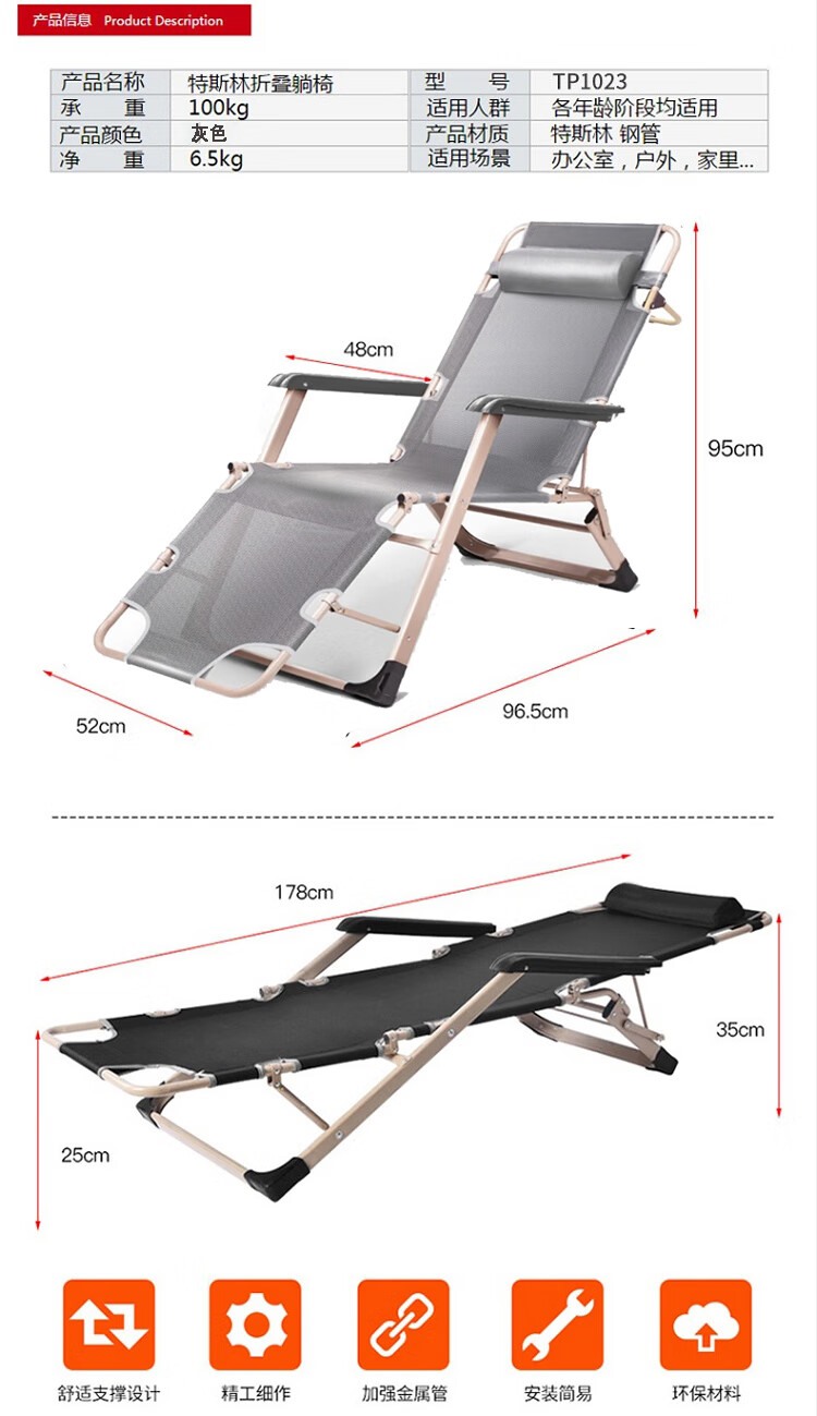 商品名称:【精选】三极户外 TP1023 特斯林折叠躺椅 178*52*25cm 灰色(单位:张) 黑色