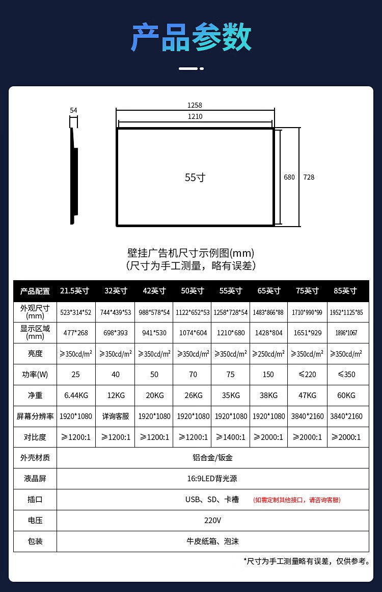 商品名称:【精选】互视达(HUSHIDA)65英寸 壁挂广告机 显示屏 奶茶店电梯商场吊挂数字标牌高清led屏 安卓 CW-ZZGW-65(单位:台)