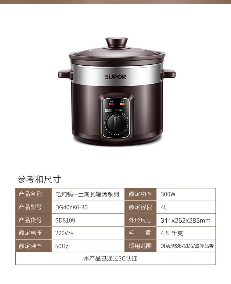 商品名称:【精选】苏泊尔 DG40YK6-30 土陶瓦罐汤系列电炖锅 4L (计价单位:台) 紫色