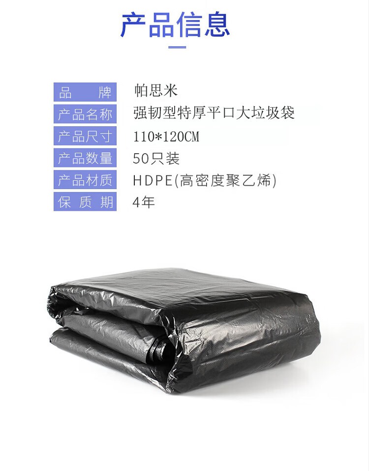 商品名称:【精选】帕思米 平口大垃圾袋 GJC-PSM10013 强韧型特厚 110*120cm 50个/扎 (黑色)