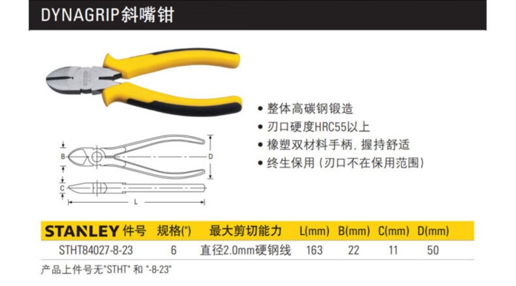 商品名称:【精选】史丹利 黑色双塑柄斜嘴钳 84-104-23 5"