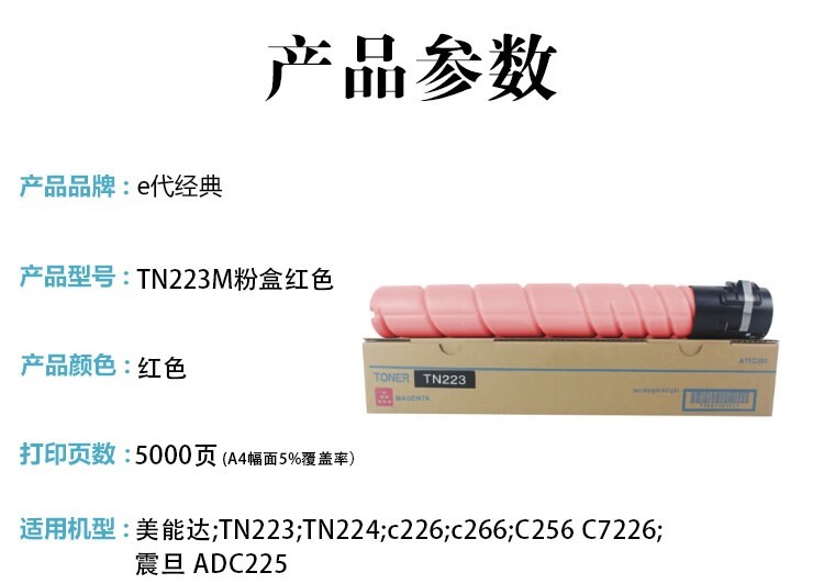 商品名称:【精选】e代经典 (GBHX)美能达TN223M粉盒红色 适用柯尼卡美能达 C226 C266 震旦 ADC225碳粉盒